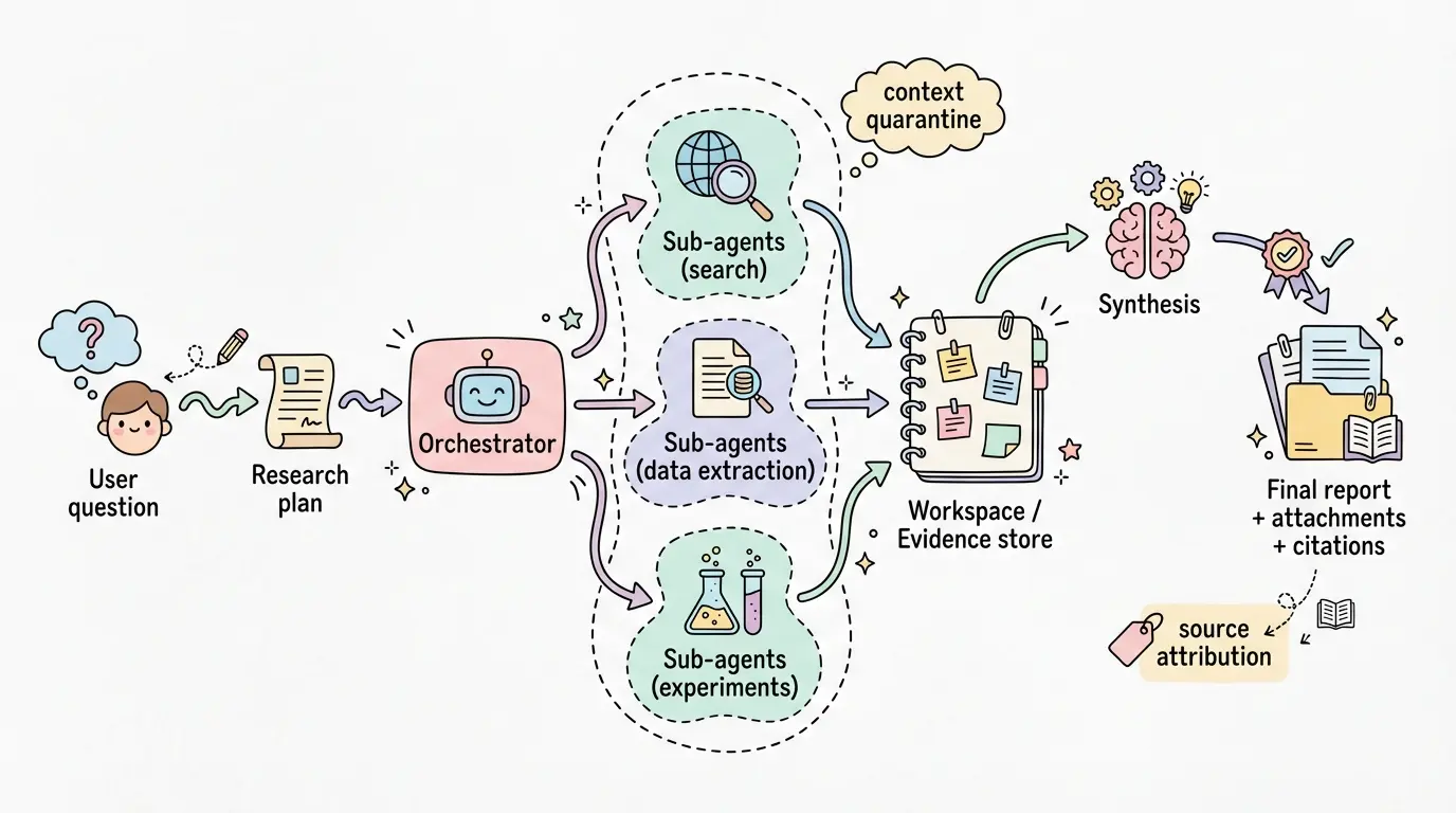 • 文件系统作为记忆:将长文本、代码片段、表格与中间产物写入 workspace,再按需读回(避免 context overflow)。