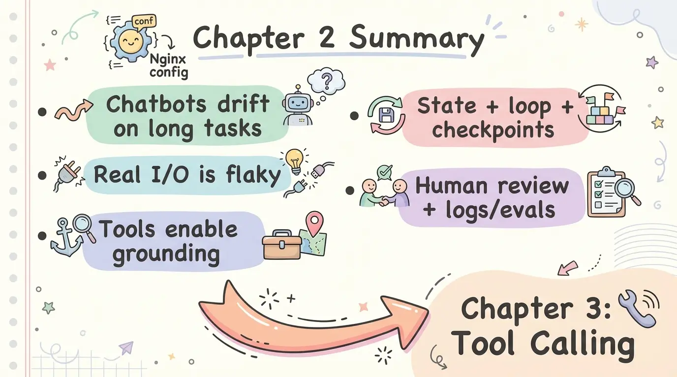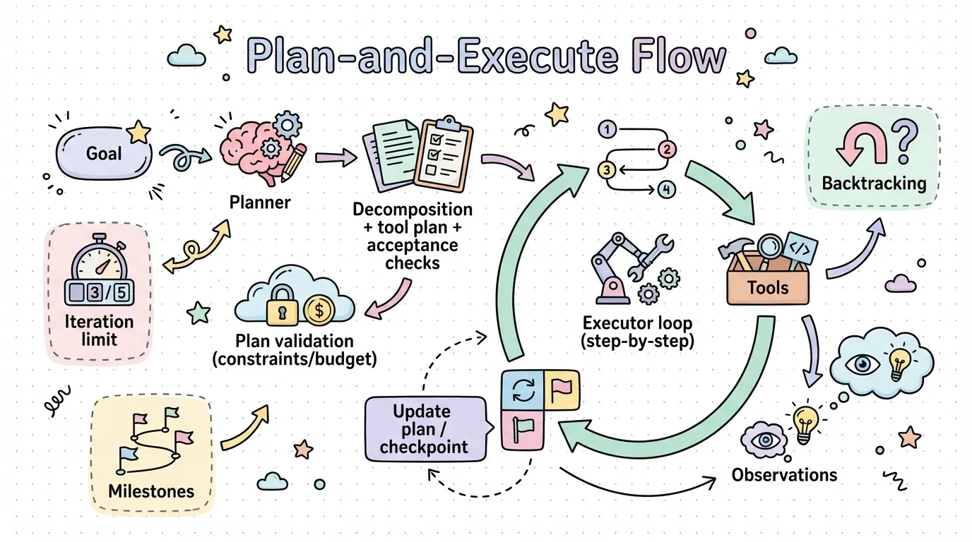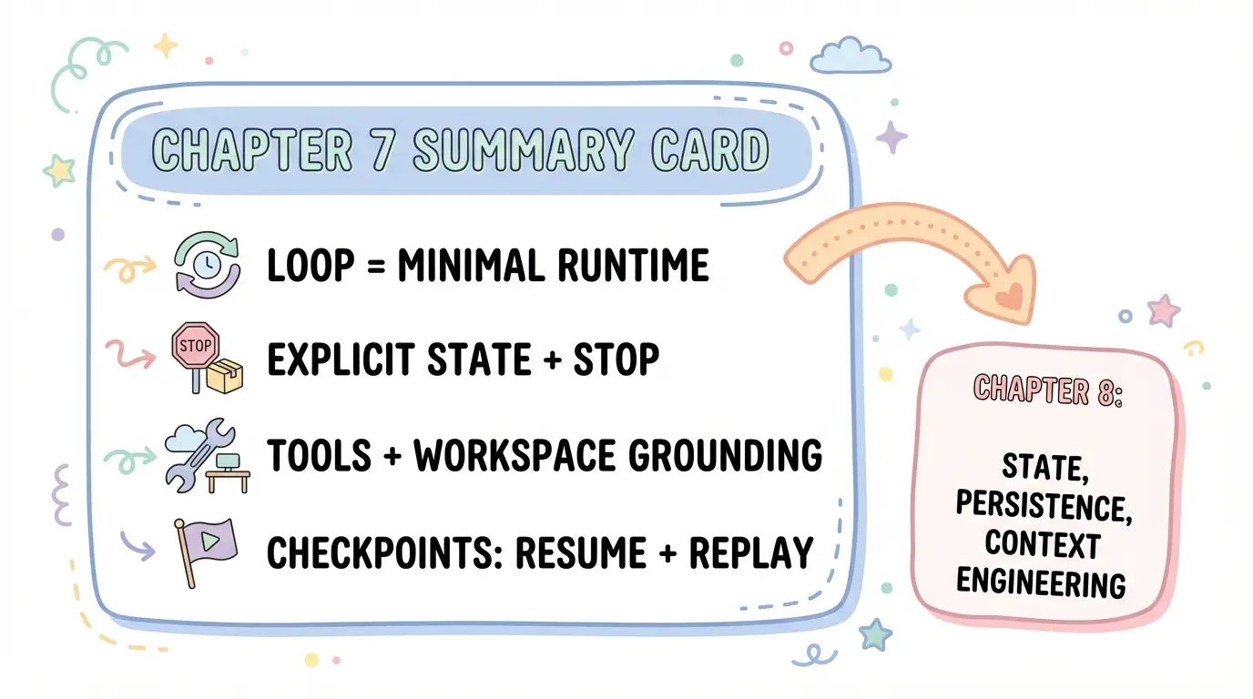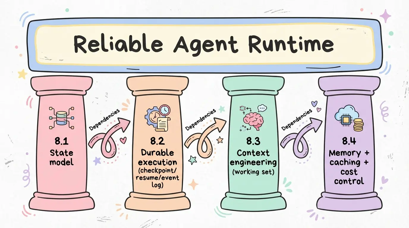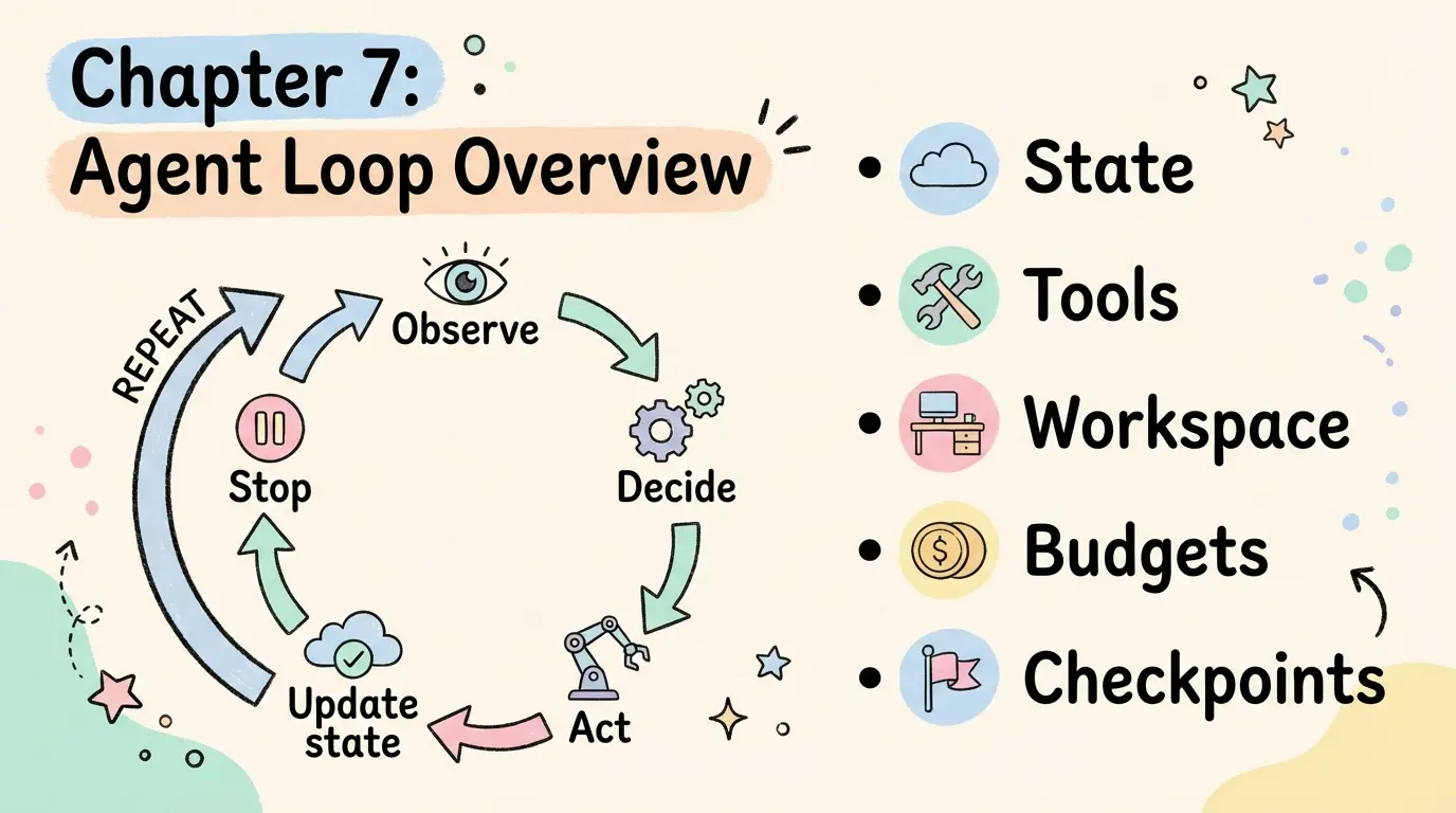 • 用状态与循环控制长任务(step budget、检查点、恢复);