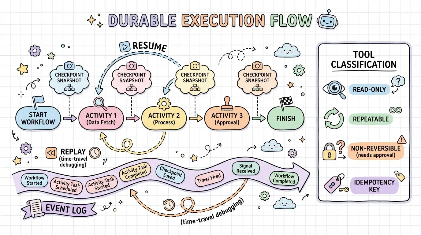 • 结果重放优先:恢复时优先使用历史工具结果,避免因外部环境变化导致“同一步不同结果”。