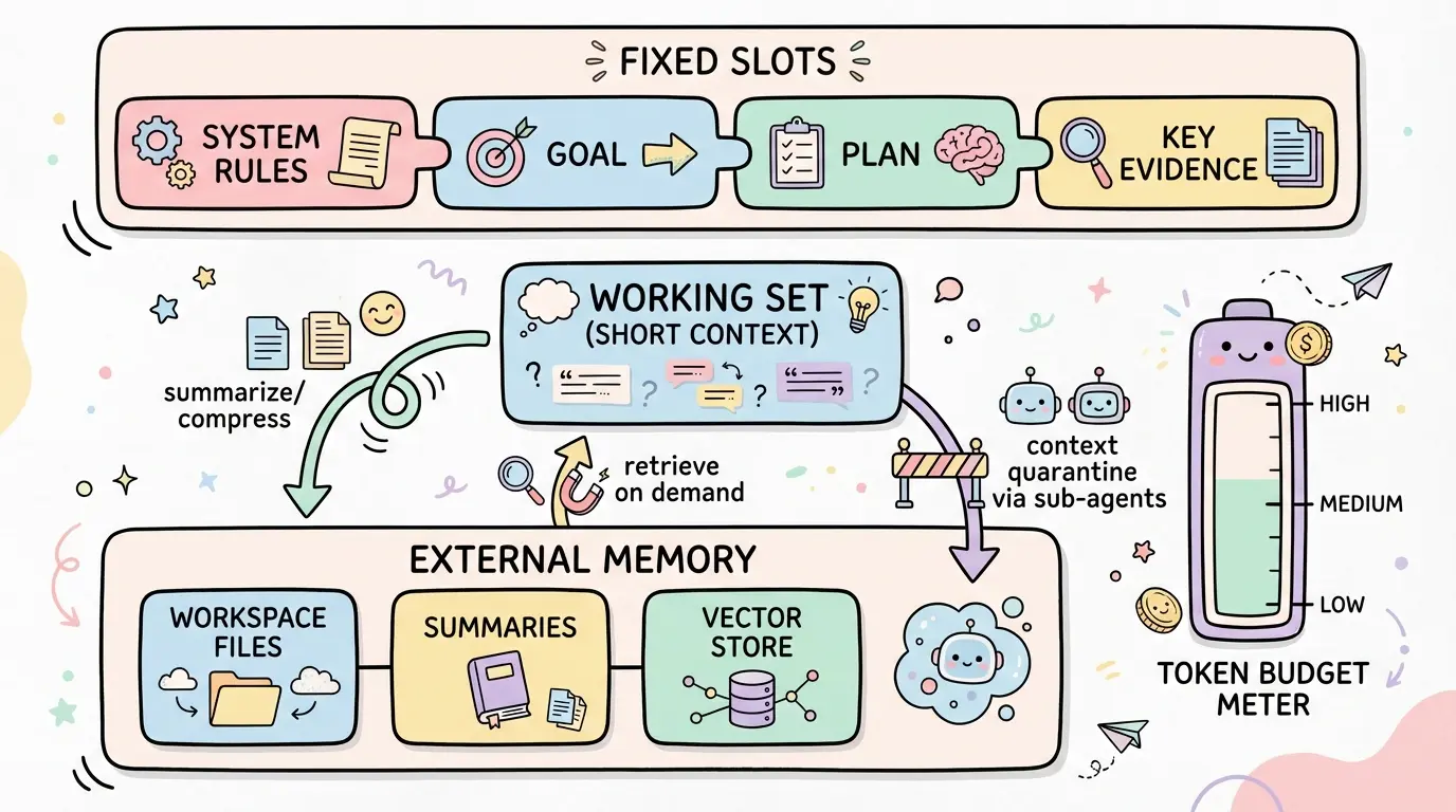 • Working set:把当前决策必要信息维持在短上下文;其余内容外置。