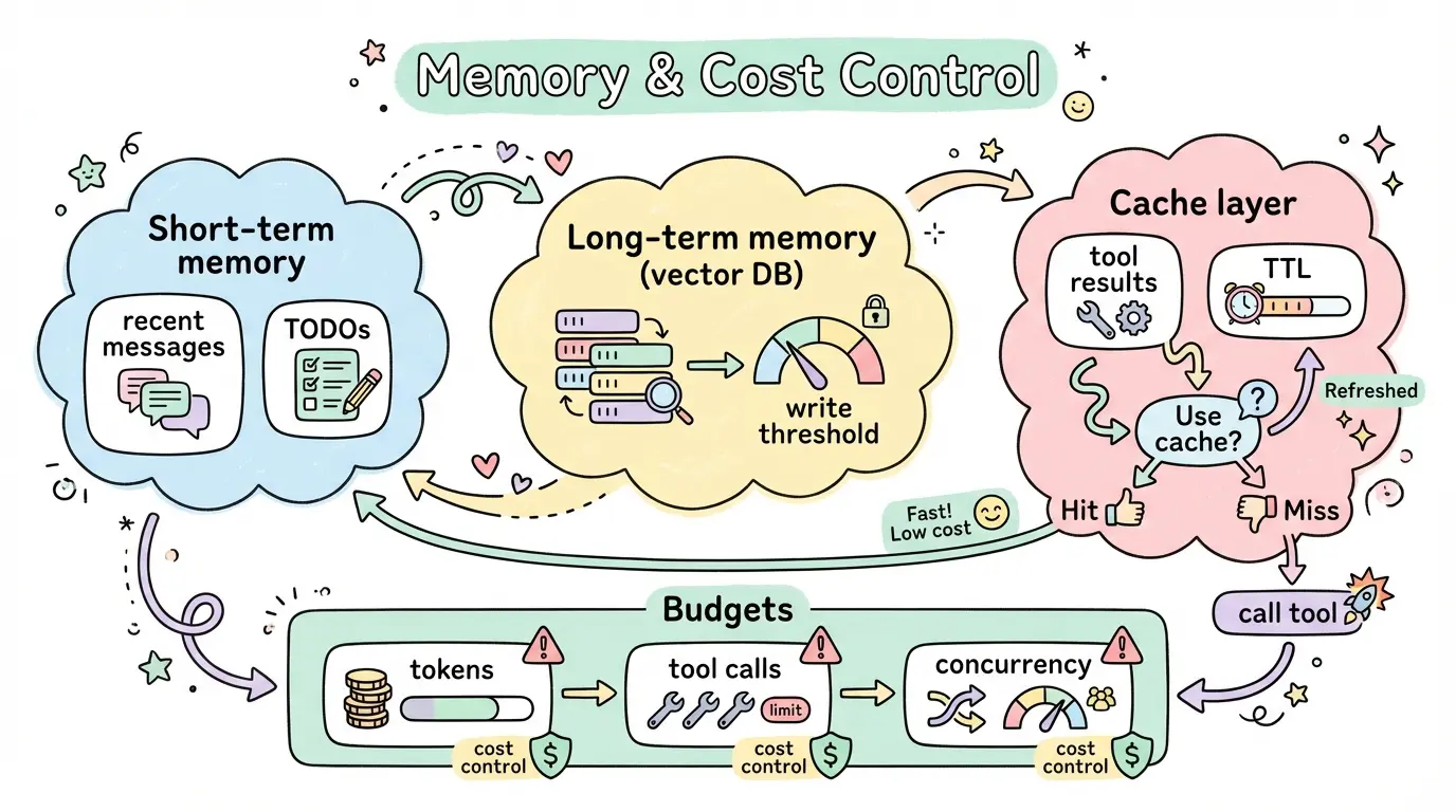 • 成本预算:同时约束 token 与 tool call 次数;在并发场景下要设置 max_concurrency,防止工具风暴与费用失控。