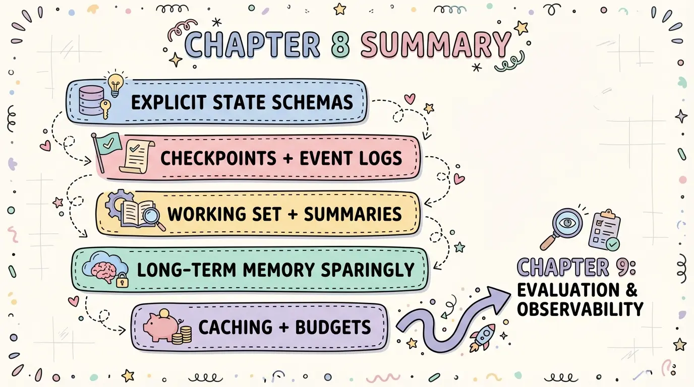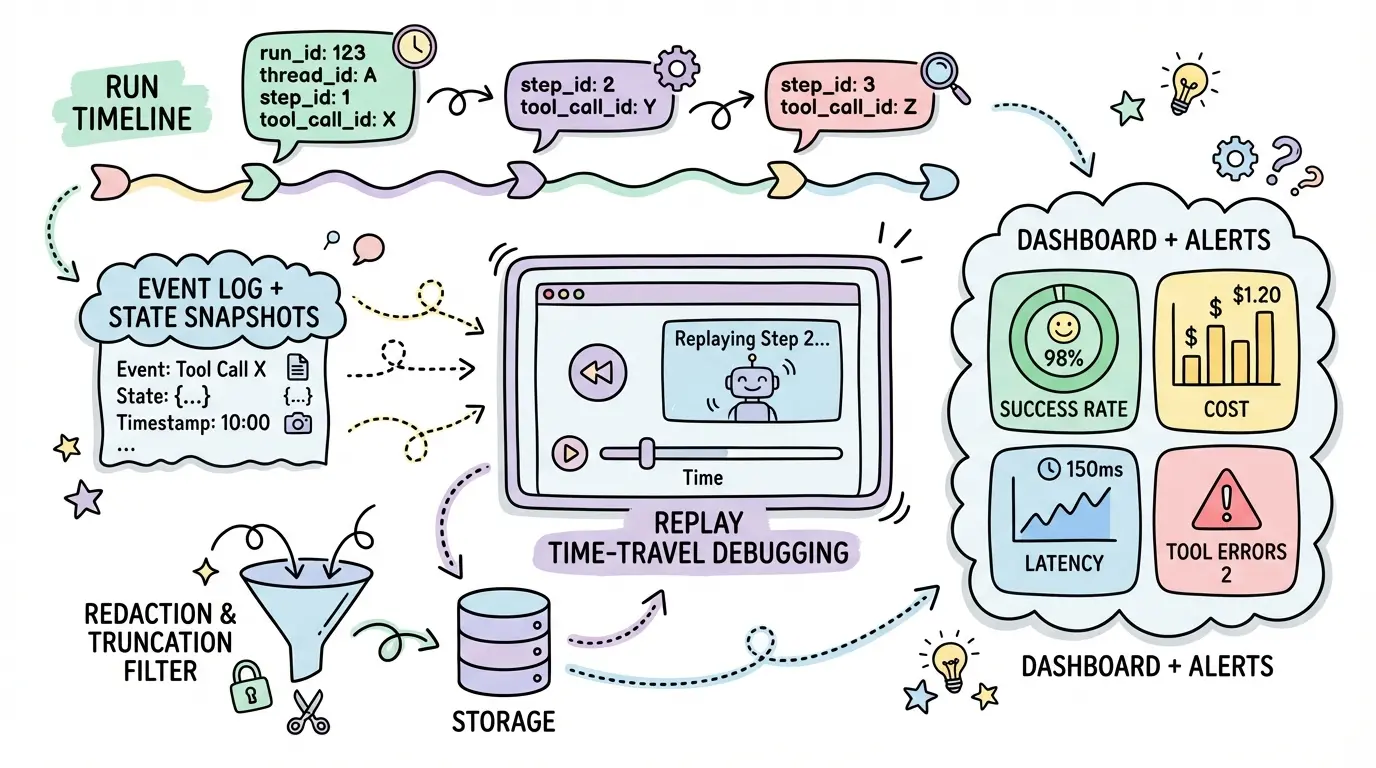 • 事件日志 + 快照:记录关键事件(Observation/Decision/Action/ToolResult/StateUpdate)以及必要的状态快照,支持 time-travel debugging。
