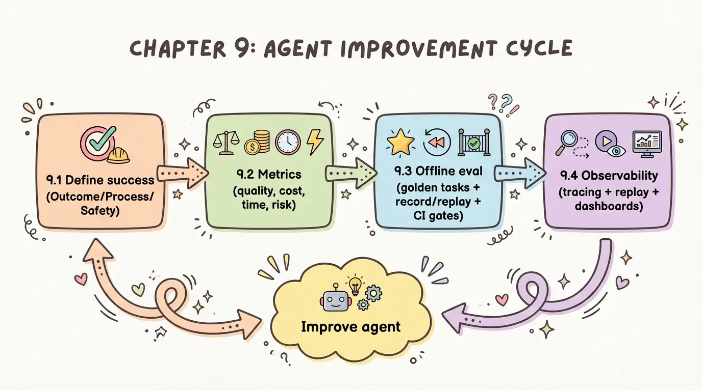 • 指标面板与告警:把 9.2 的指标落到 dashboard(成功率、成本、延迟、工具错误、循环率),并为突发退化设置告警与自动降级策略。