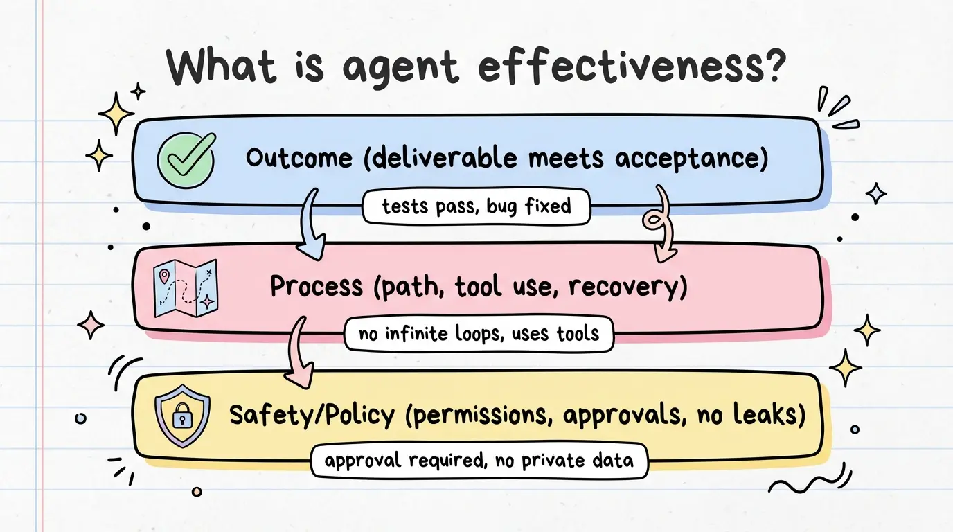 Agent 的“效果”不是单轮回答质量,而是一个端到端执行系统的综合表现。更可操作的定义通常包含三层: