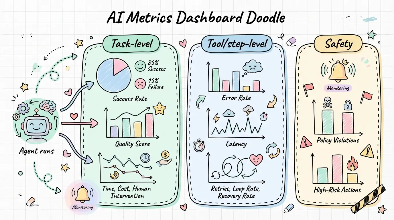 一套能落地的指标通常会同时覆盖质量、效率与风险,并能分解到 task/step/tool 三个层级: