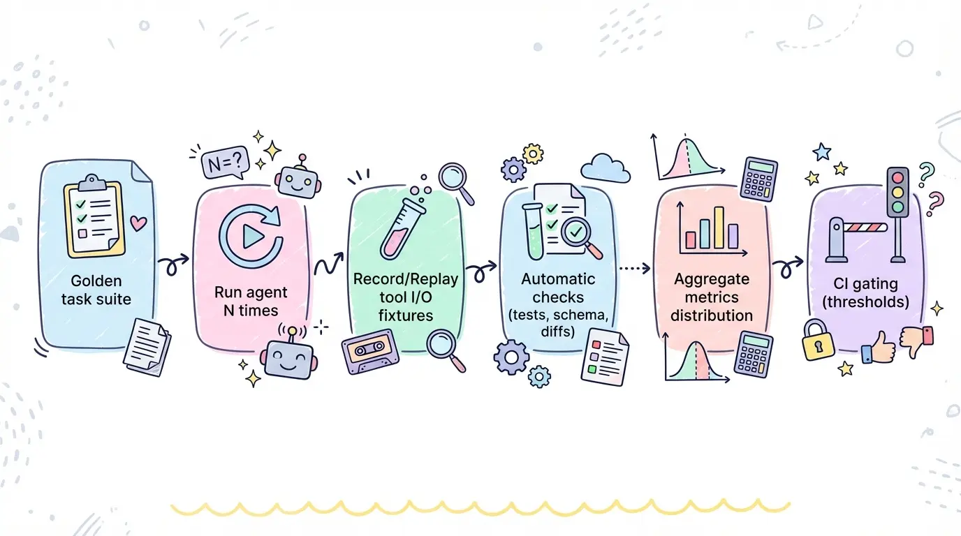 评测的终点不是“跑出一个分数”,而是形成稳定的反馈闭环:每一次线上事故与失败 case,都能沉淀进 task suite,变成下一次的回归用例。