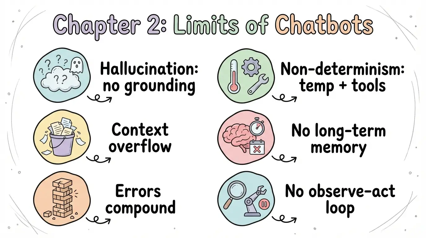 仅靠一次或少数几次模型调用,Chatbot 在长流程任务上存在结构性瓶颈,典型体现在: