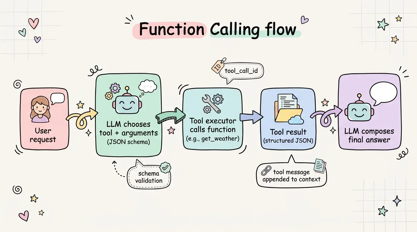 Function Calling 把“动作”从文本里抽离出来,成为可校验、可执行的结构化输出:模型决定“是否调用、调用哪个工具、参数是什么”,系统负责执行与回填结果,再由模型整合为最终响应。([OpenAI Platform][1])
